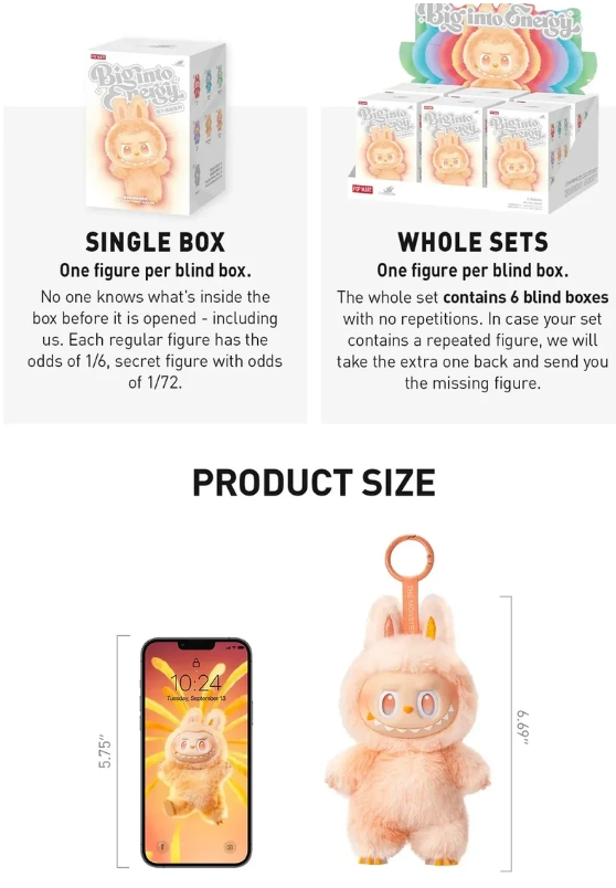 Bring home a little monster with a big personality. Labubuâ˘â Big Into Energy Series combines art, emotion, and surprise in one lovable collectible. Perfect for all agesâunwrap joy with every box!